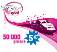 TGV fête ses 25 ans et nous réserve une offre exceptionnelle pour des voyages directs en TGV du 5 octobre au 9 décembre 2006: 50.000 places à 5.00 euros. Rendez-vous le 21 septembre à partir de 12h sur voyages-sncf.com !